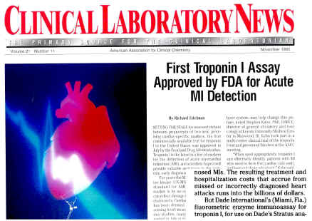 The first commercially available Troponin I Immunoassay was developed at Dade International (aka: Baxter Diagnostics, Inc/Dade-Behring, Inc) , Miami, Florida back in the summer of 1995. I was fortunate enough to be part of this exciting project. I worked on the stabilization and optimization of cardiac Troponin I and the actual development of this test. It was an exciting 4.5 years that took to complete the project and get expedited review from the FDA. The assay gave the company an edge for about 3 years before competitors realized that they had fallen behind in the cardiac markers arena. Baxter always enjoyed a great position as they also had one of the first CKMB mass assays in the market. Troponin was the next generation of the cardiac assays. Anyways enjoy the reading. Upon completion of the project the USPTO awarded the scientist that worked on this assay a patent for some of the work involved. (See documents)