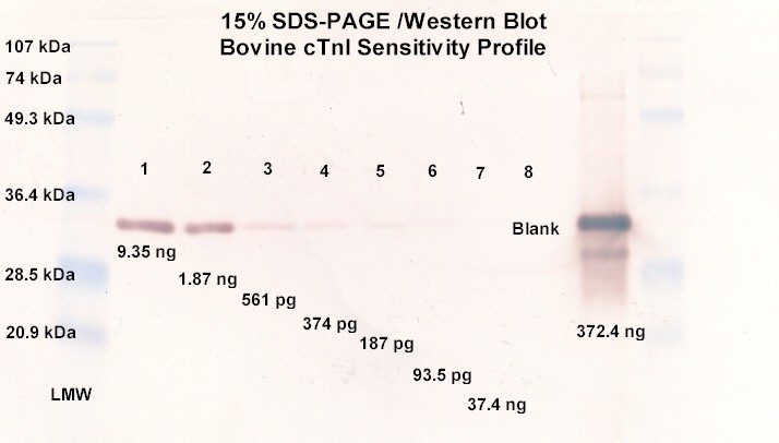is a western blot of bovine cardiac troponin I. These blots can detect down to